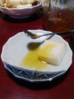 町を散歩していたら豆腐屋のおっちゃんに声をかけられて、油揚げ(揚げたて)をゴチになる。